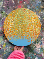 My first ever circle canvas piece - a joyful burst of autumn colours with warm golds, greens and soft sky blue. One-of-a-kind art!