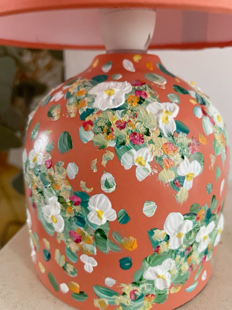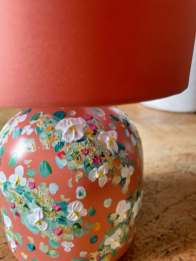 This is a one-of-a-kind terracotta lamp adorned with hand-painted blooms. Compact and full of character, it brings warmth and joy to any corner of your home.