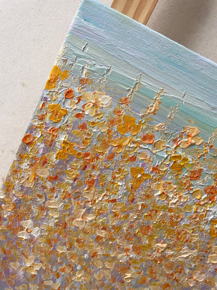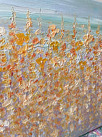 A textured meadow painting full of soft golden and pastel blooms, capturing the gentle glow as summer drifts into autumn.